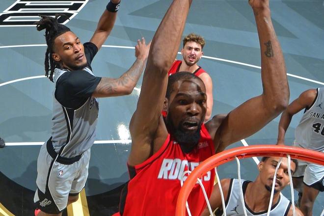 火箭队的整体处境,就像第三节的杜兰特,防守端被文班亚马无情隔扣,进攻端陷入单打。火箭队全场20次失误,杜兰特一人就有8次,今天面对大一号的‘自己’,确实是有心无力。当杜兰特和火箭队的整体攻防体系割裂的时候,这支火箭队很难赢球。马刺队找到了文班亚马被限制时的解决方法,那就是其他球员必须站出来。但火箭队,似乎还没有找到缺少范弗利特后的好方法。虽然奥科吉被放到首发后,球队豪取五连胜,且奥科吉今天12分3篮板5抢断的表现很是出色,但全场0助攻仍然能看出他的组织能力确实不够看。杜兰特24分1篮板2助攻1抢断,还有8次失误。另外,乌度卡今天的五大阵容,确实让人看不懂……